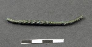 Spillone con capocchia mancante, collo ingrossato e decorato a tortiglione, distinto sia dal gambo che dalla capocchia da un repentino restringimento. Gambo a sezione circolare.