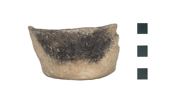 Vaso troncoconico con orlo arrotondato, parete rettilinea svasata e fondo piano. Impasto medio grigio, superficie lisciata opaca beige-nera.\n