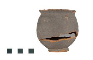 Olletta a corpo ovoide con orlo estroflesso e modanato e con piede a disco. Corpo ceramico abbastanza grossolano di colore giallo rossastro (si vede poco per la superficie incrostata di terra). Permane il dubbio che la parte superiore e inferiore siano effetivamente pertinenti (non sono contigue).\n