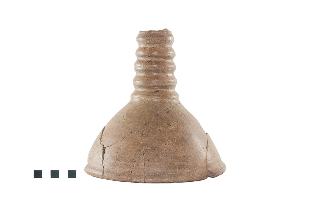 Porzione di incensiere in ceramica d'impasto, colore bruno, composto da alto fusto a costolature, parte inferiore a tromba con bordo arrotondato.\n