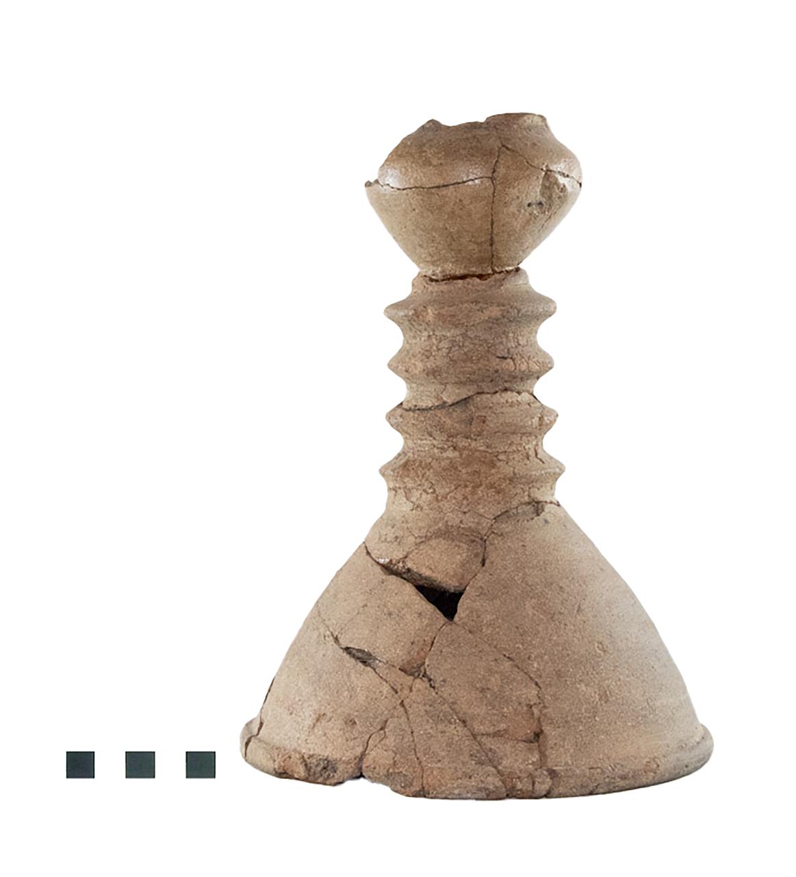 Incensiere in ceramica d'impasto, colore bruno, composto da elemento superiore globulare con bordo rientrante, alto fusto a costolature, parte inferiore a tromba con bordo ingrossato all'esterno.\n