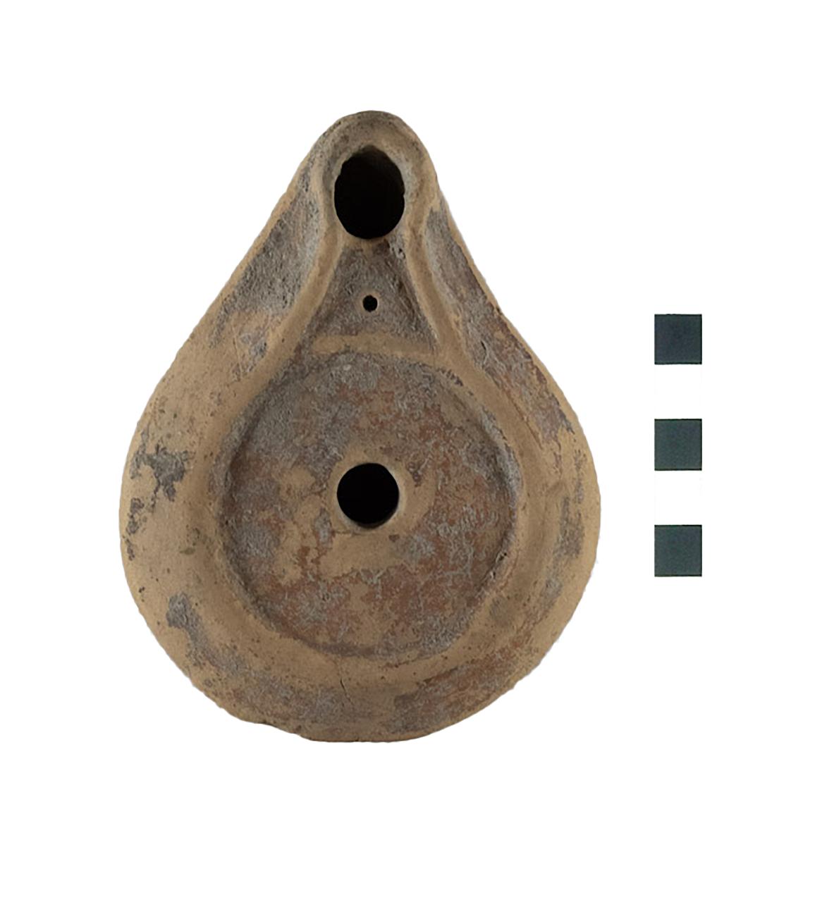 Lucerna (Firmalampe) a canale chiuso, molto consunta sul fondo, annerita presso il foro di bruciatura e la spalla. Corpo ceramico rosato. Il rivestimento rossastro è molto scrostato (è parziamente coperto da un'incrostazione di terra). Sembra un tipo di passaggio fra le Firmalampen a canale chiuso e quelle a canale aperto. \n