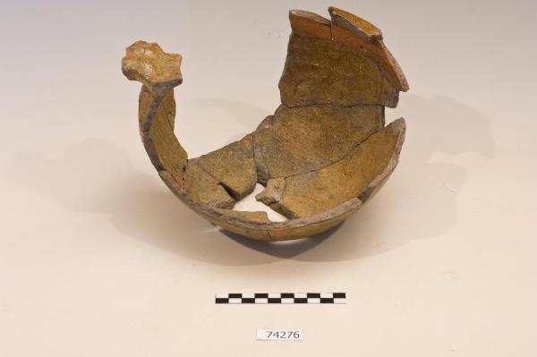 Biconico, ad orlo introflesso a tesa orizzontale; cordone poco marcato nel punto di massima espansione della parete; fondo leggermente concavo; ansa a nastro tricostolata sormontante a tesa.\nAll'interno, larghe (da 5 a 10 mm), poco profonde solcature da tornio.\nDalla porzione di vaso conservata, non si può stabilire se fosse provvisto di una o due anse.\nSono probabilmente riferibili a questa forma quattro frammenti di bordo, di cui uno con attacco di ansa tricostolata, pertinenti ad altrettanti recipienti.