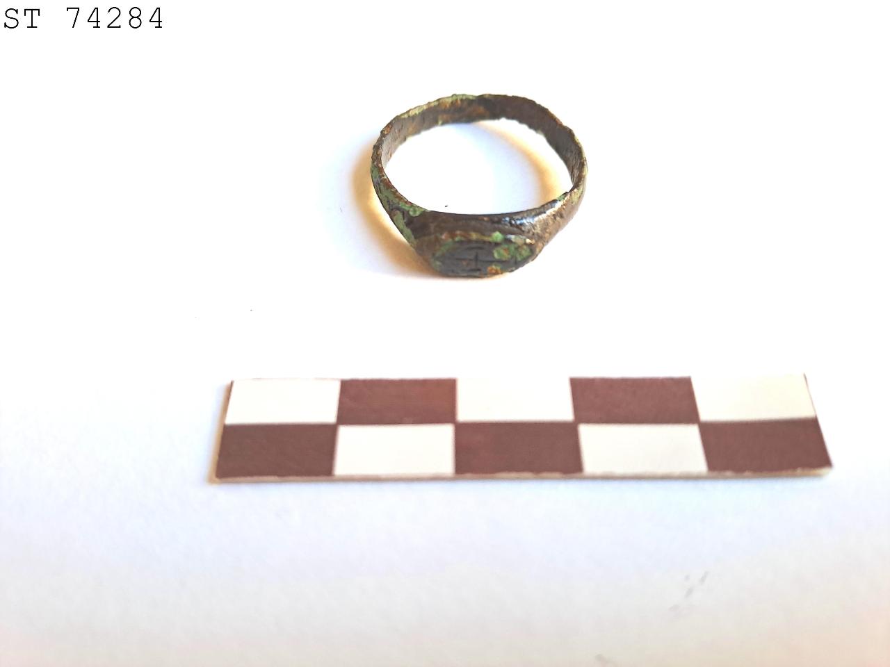 Anello digitale.\nVerga piatta a sezione pseudo ovale e castone, costituito dall'ingrossamento della verga, rilevato, ovale, a specchio piano segnato da croce incisa.