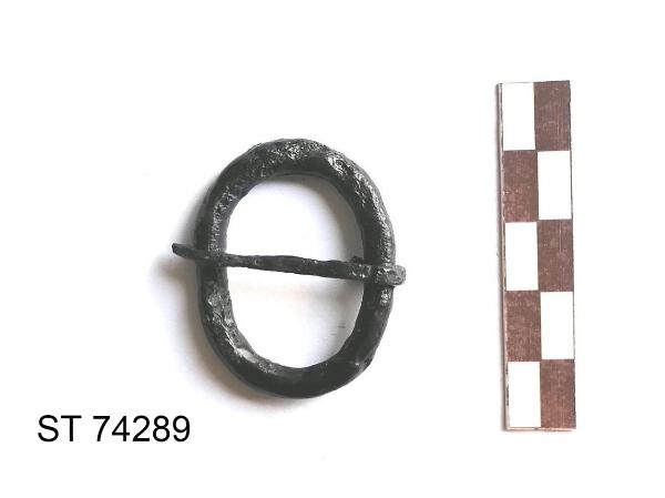 Fibbia da cintura.\nAnello ovale irregolare, a sezione approssimativamente ovale.\nArdiglione sottile, appuntito, ripiegato a formare la maglia di articolazione dell'anello.
