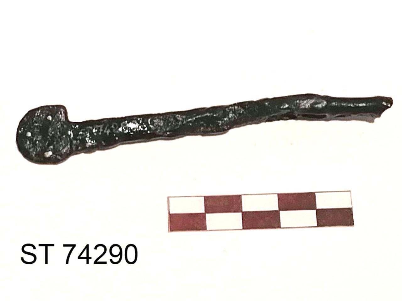 Fr. di sperone (?)\nLa frammentarietà impedisce l'identificazione sicura del reperto. \nResta una stanghetta, a sezione grossomodo rettangolare, con terminazione a scudetto.\nDalla parte opposta, a poca distanza dalla frattura, l'asta si ingrossa a contenere due piccole maglie (una occlusa). \n