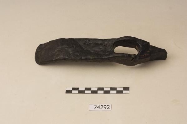 Piccone.\nCorpo a barra lievemente trapezoidale, leggermente ricurvo, sagomato a punta ad un capo, con taglio arcuato dall'altro.\nOcchio per inserirvi il manico ligneo decentrato verso l'estremità appuntita. Residui di legno carbonizzato.