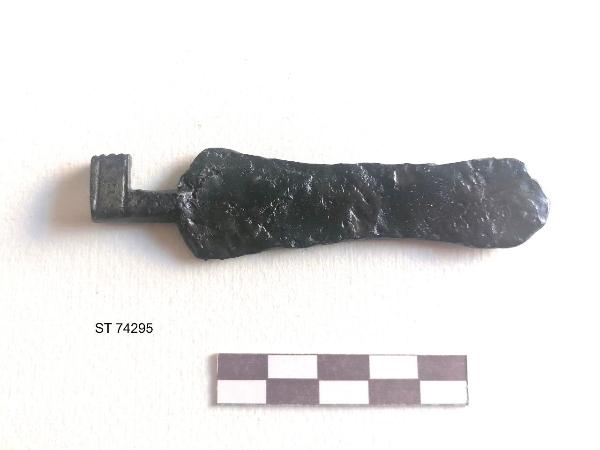 • NOTIZIE STORICO CRITICHE cfr. Monte Barro ala Est, US 59; ala Nord, US 400\n\nL'impugnatura a piastra, molto più lunga del fusto, trova confronti più o meno puntuali con esemplati di epoca romana, in ferro e bronzo, rinvenuti in tutte le regioni dell'impero.\nPiù difficile il riscontro preciso per l'ingegno, che nelle chiavi romane è generalmente più sottile e allungato, obliquo rispetto al fusto e provvisto di un numero maggiore di denti.