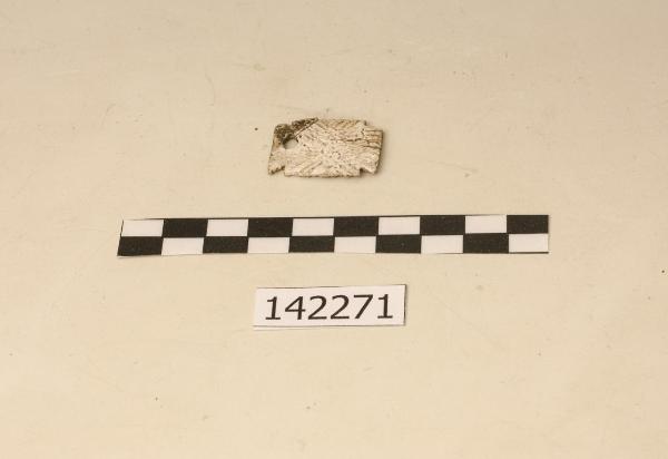 Ciondolo rettangolare sagomato con foro per l'appensione, decorato lungo il bordo da tacche grossomodo disposte a spina di pesce.