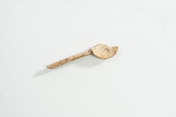 Cucchiaio per sostanze cosmetiche in osso, liscio, composto da una conca rotonda e un manico a bacchetta a sezione circolare.