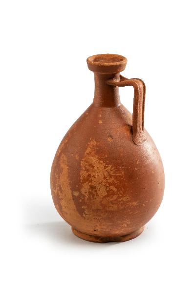Olpe in terra sigillata con orlo a fascia ed corpo piriforme; la parte inferiore della pancia è ribassata, l'orlo estroflesso con pareti esterne verticali, leggermente oblique, collo cilindrico, ansa a nastro con due costolature, impostata sul collo e sulla pancia, piede a disco.