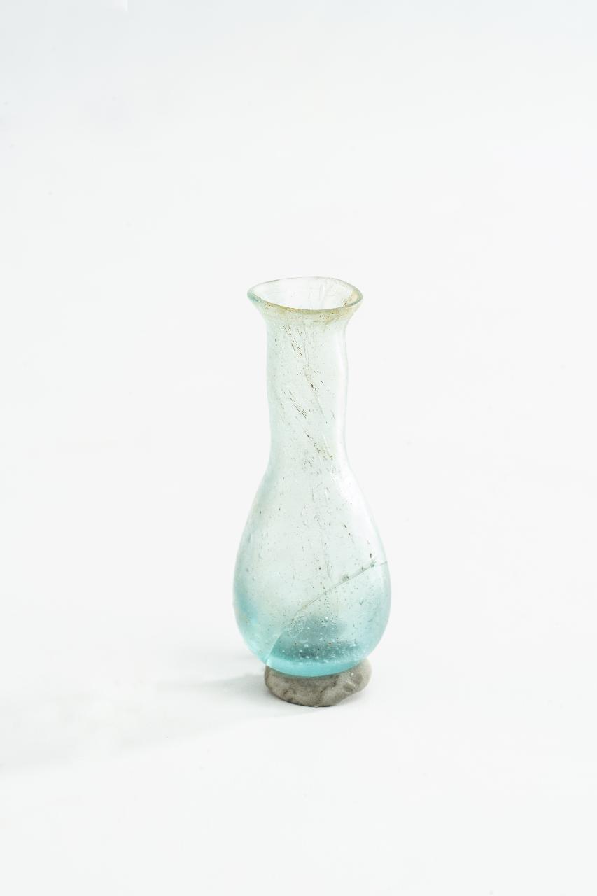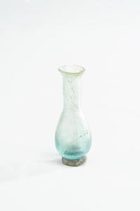 Balsamario tubolare, allargato verso il fondo, con strozzatura all'attacco del collo, labbro indistinto svasato, fondo leggermente concavo. Vetro color azzurro, trasparente.