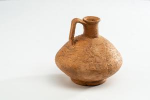 Olpe a corpo piriforme schiacciato, orlo diritto, collo cilindrico; presenta un'ansa a nastro a due costolature piegata a gomito e saldata alla spalla e al collo; piede a disco.