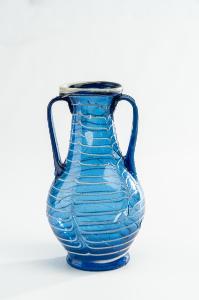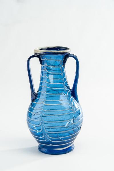 Anforetta biansata con alto collo verticale, collo cilindrico, corpo ovoidale.. Piede a disco a base concava. Le anse a nastro, con profonda scanalatura centrale, sono impostate sulla spalla e saldate sul collo. Colore blu con decorazione "a piume" ottenuta con filamenti bianchi opachi applicati sul corpo.