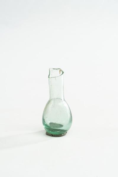 Balsamario tubolare, allargato verso il fondo, con strozzatura all'attacco del collo, labbro indistinto svasato, fondo leggermente concavo. Vetro color azzurro, trasparente.