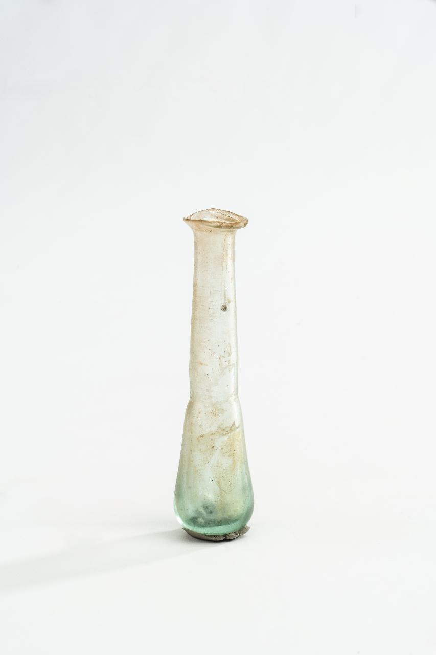 Balsamario tubolare a profilo continuo, labbro svasato. Vetro di colore verde chiaro, trasparente.