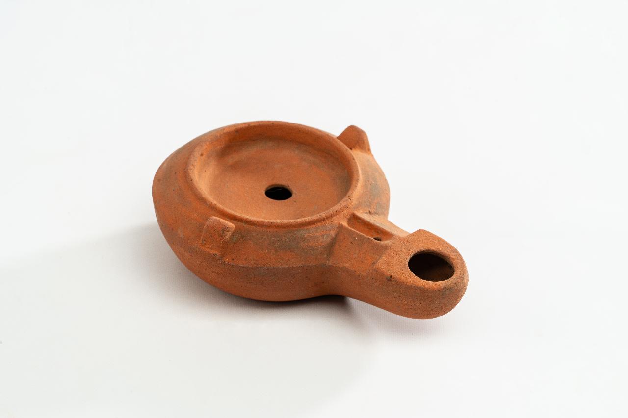 Lucerna a canale chiuso con spalla estroflessa con due appendici piramidali lievemente spostate verso il basso. Il disco è liscio e ribassato, circondato da un alto bordo. La base, delimitata da due circonferenze impresse, reca il marchio di fabbrica COMMUNIS a lettere consunte.