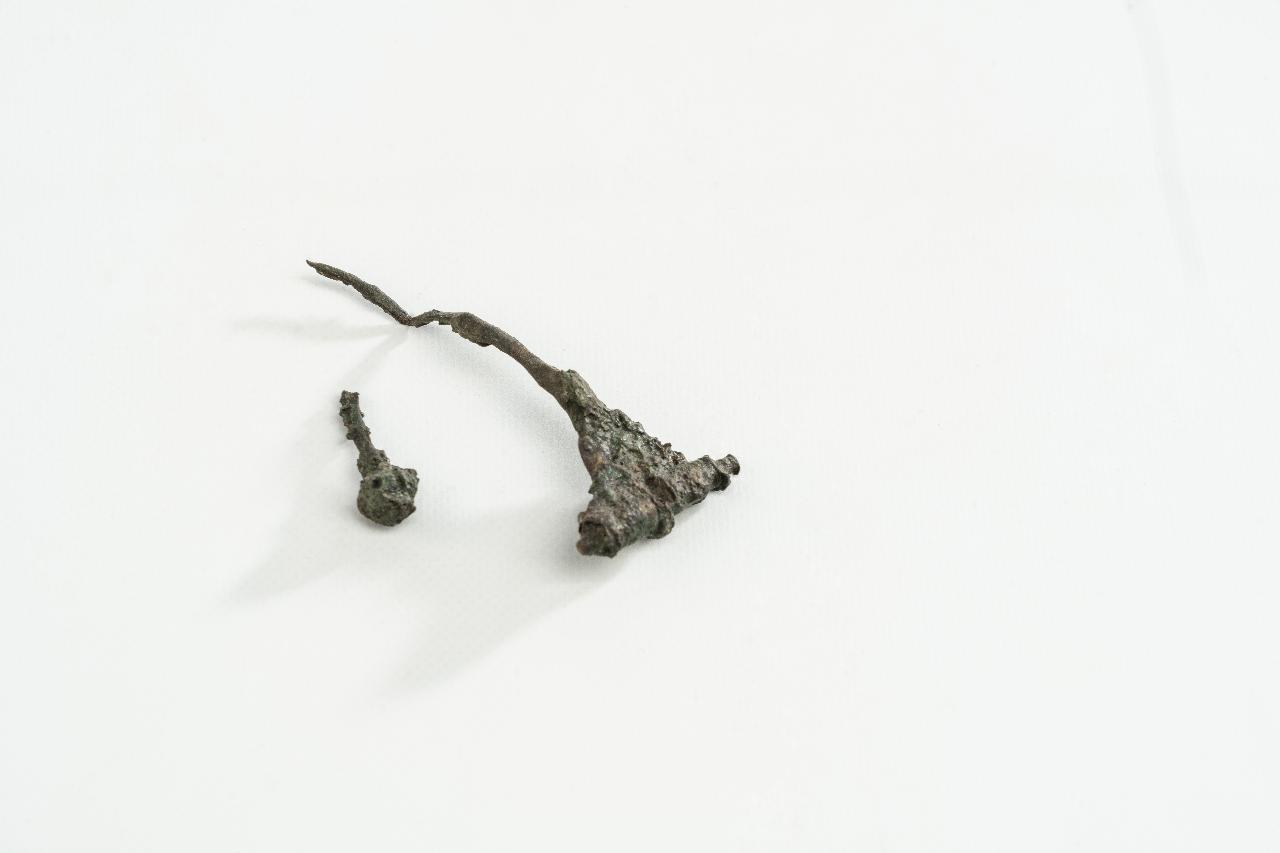 Fibula tipo Aucissa, con arco a fettuccia scarsamente conservato e fissato all'ago tramite una cerniera; la staffa sembra avere un'appendice a globetto