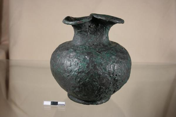 Brocca ad orlo trilobato molto espanso, collo cilindrico, corpo globoso, fondo con piede cilindrico. Nella zona di attacco tra collo e spalla sono presenti 4 scanalature concentriche, accoppiate a due a due.\n