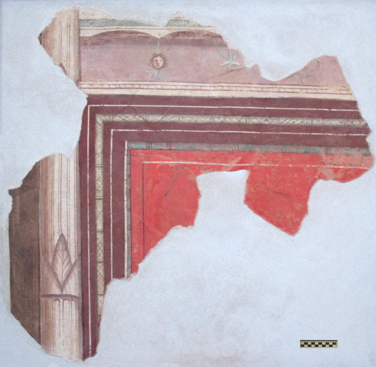 La decorazione è relativa alla zona mediana e al punto di passaggio verso la zona alta dell’anticamera del cubiculum detto Stanza di Arianna. Conserva anche parte della quinta architettonica che racchiudeva il quadro figurato.