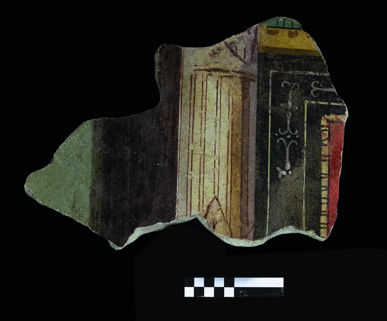 La decorazione è relativa all’anticamera del cubiculum detto Stanza di Arianna e costituisce la parte alta della colonna che fa da quinta architettonica per il quadro figurato.\n\n\n