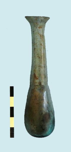 balsamario in vetro soffiato azzurro, corpo piriforme e lungo collo tubolare, con leggera strozzatura alla base dello stesso. Labbro tagliato e arrotondato.