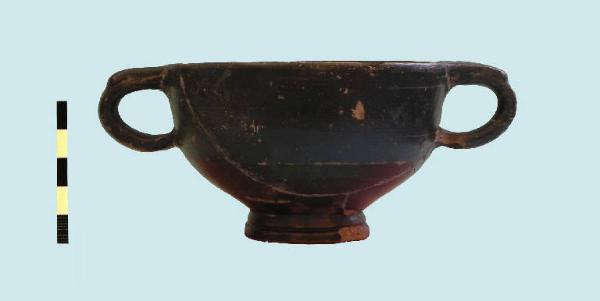 coppetta biansata in vernice nera, vasca bassa arrotondata, piede sagomato a fondo convesso, orlo indistinto, anse a nastro costolate impostate verticalmente da metà della vasca all'orlo.