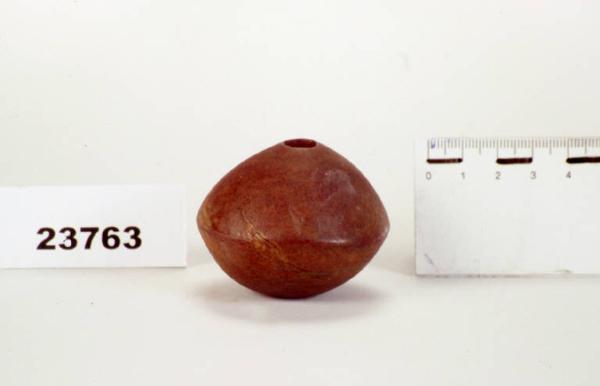 Grossa perla in ambra di forma biconica, con foro passante al centro.
