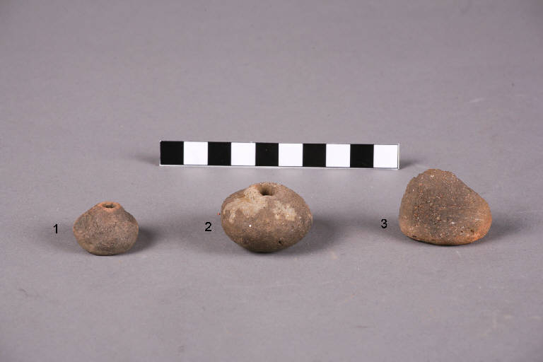Tre fuseruole, di cui una a disco, con foro passante