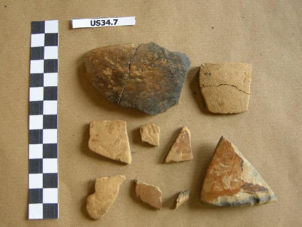 Frammenti pertinenti ad un recipiente con superfici di colore arancio, decorato a stralucido con motivi a zig-zag.