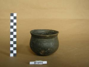 Bicchiere a corpo globulare, di foggia larga e bassa, privo di collo, con ampia imboccatura a labbro estroflesso, piccolo fondo ombelicato. Superfici di colore bruno scuro decorate tra tre costolature sotto il labbro.