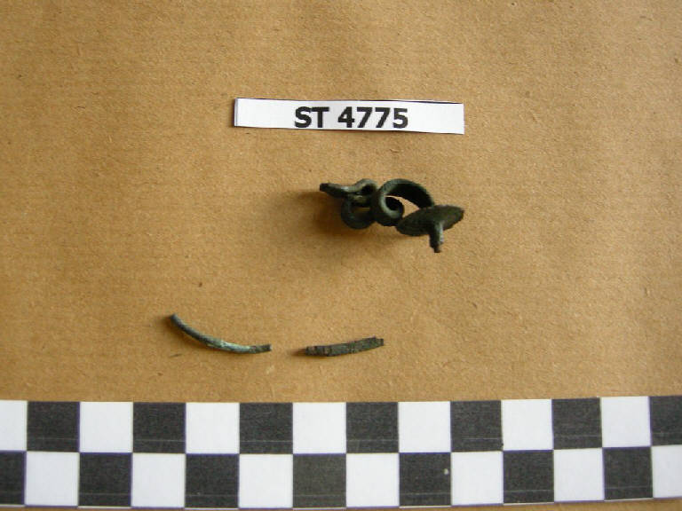 Frammento di arco riferibile ad una fibula ad arco serpeggiante con sezione a nastro, decorato da sottili incisioni lineari presso il disco fermapieghe. Pertinenti probabilmente anche due frammenti a sezione circolare, identificabili come ardiglione.