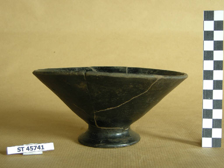 Coppa a vasca troncoconica rigida, labbro diritto, orlino arrotondato alla sommità, su basso piede svasato a tromba. Le superfici sono nere, rese a stralucido; tracce evidenti dello strumento utilizzato per la lucidatura.