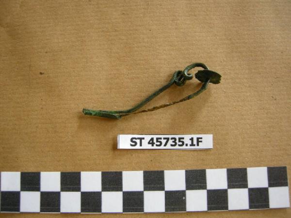 Fibula ad arco serpeggiante con arco rialzato a sezione quadrangolare, disco fermapieghe piuttosto ampio, piatto e liscio, staffa con sezione a "J".