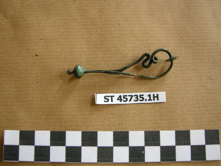 Fibula ad arco serpeggiante con arco a sezione circolare e quadrangolare, sottile, disco fermapieghe piccolo e lenticolare, breve staffa con sezione a "J" profilata verso l'estremità e desinente con un globetto ed appendice troncoconica a base bombata.