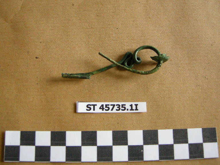 Fibula ad arco serpeggiante con arco a sezione quadrangolare, disco fermapieghe piuttosto ampio, staffa con sezione a "C".