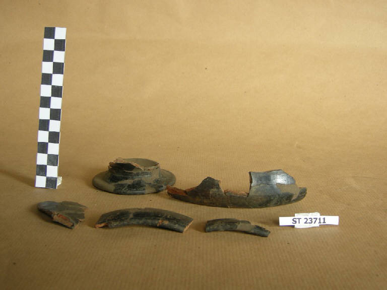 Ciotola a vasca probabilmente troncoconica, labbro decisamente rientrante, orlo arrotondato, su bassissimo piede svasato. Impasto rossiccio, superficie nerastra; decorata a stralucido con una fascia all'altezza del labbro esterno e sull'attacco piede e con motivo a reticolo sulla vasca esterna.
