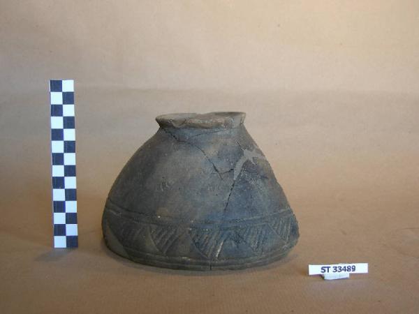 Ciotola a vasca troncoconica, labbro rientrante con orlo assottigliato, bassissimo piede ad anello; superfici da bruno chiaro a nerastro, decorata ad impressione a finta cordicella sotto il labbro con una fascia di denti di lupo capovolti.
