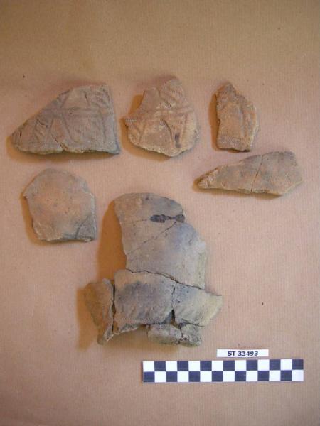 Urna a profilo nettamente biconico, fondo piano distinto; impasto bruno medio, superfici con tracce di ingobbio; decorata sopra la massima espansione ad impressioni a finta cordicella, secondo il motivo della doppia fascia di denti di lupo, molto irregolari: talvolta sono resi come elementi quadrangolari; sopra il fondo, doppia linea circolare frangiata verso l'alto.