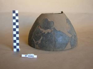 Ciotola a vasca troncoconica profonda e profilo arrotondato; labbro leggermente rientrante, orlo assottigliato. Superfici bruno rossastro con infiammature nerastre.