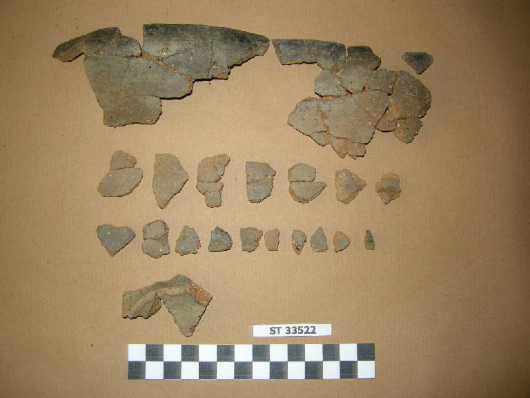 Frammenti in impasto molto grossolano, di colore bruno scuro in superficie e rossastro in frattura, pertinenti ad una ciotola a vasca troncoconica e labbro decisamente rientrante con orlo ingrossato inernamente ed appiattito alla sommità; un frammento di fondo piano distinto.