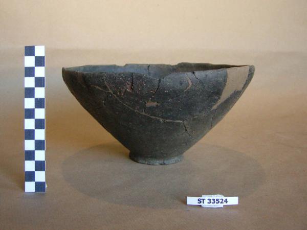 Ciotola a vasca troncoconica, labbro leggermente rientrante, piccolo e basso piede a disco. Superfici di colore bruno scuro e rossastro. Appena percettibile, sulla faccia esterna del piede, un segno cruciforme solcato.