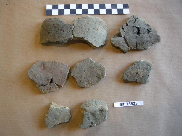 Frammenti di fondo piano e parete riferibili ad un recipiente di forma chiusa, probabilmente un'olla; superfici e corpo ceramico di colore da bruno chiaro/ beige a grigio.
