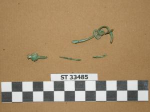 Fibula ad arco serpreggiante con sezione a nastro: la parte di arco prossima al dischetto fermapieghe è decorata da tre sottili costolature. Della staffa è conservata solo la parte terminale, profilata e desinente a globetto seguito da elemento troncoconico, mutilo.