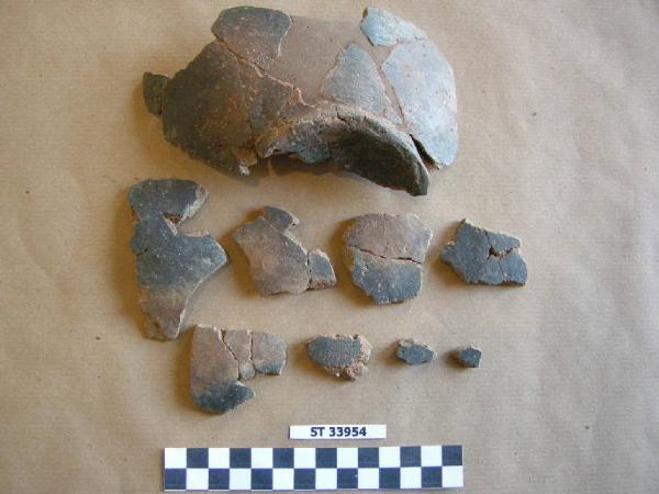 Fondo concavo probabilmente riferibile ad un'urna; impasto rossiccio in frattur, superfici da rossiccio a nero.