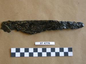 Coltello in ferro, probabilmente a dorso diritto, con lama forse serpeggiante: è però molto corroso e deformato.