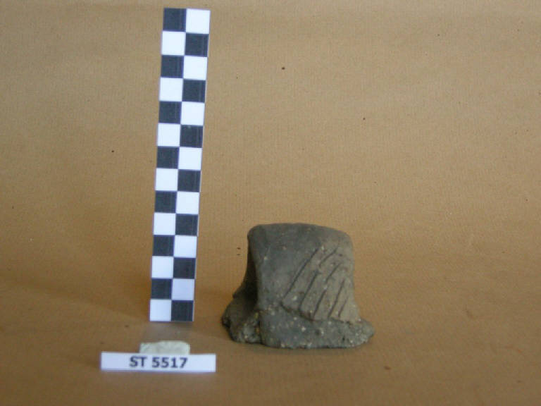 Ansa in impasto molto grossolano di colre bruno grigiastro, sezione biconvessa; la parte prossima all'attacco superiore è decorata con 5 linee oblique incise.