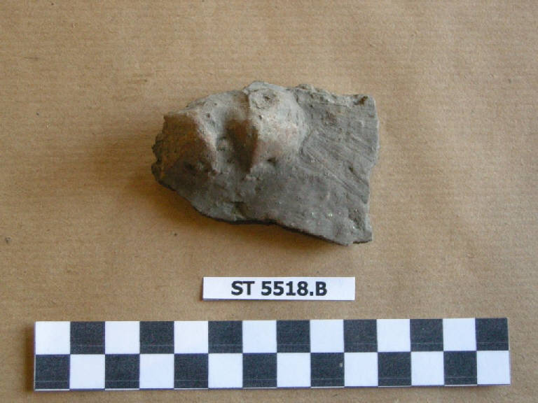 Frammento di parete con presa costituita da due bugne; impasto rossastro; riferibile ad un recipiente di uso domestico.