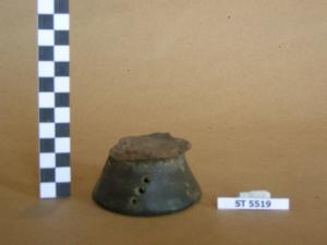 Frammento di piede troncoconico in impasto rossiccio con ingobbio bruno scuro, lisciato; è attraversato da cinque serie di due o tre forellini circolari ciascuna, disposte obliquamente lungo la superficie laterale. Originariamente riferibile ad una coppa.