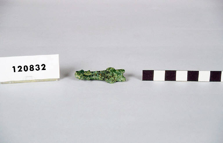 Controplacca triangolare in bronzo con terminazione a scudetto apicato.